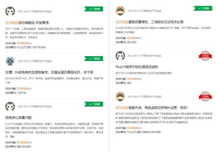 消费者的不满主要集中在二个方面,无印良品产品的质量和线上线下的服务品质上。据黑猫显示数据,输入关键词“无印良品”,投诉词条达2436条,其中产品质量占多数。